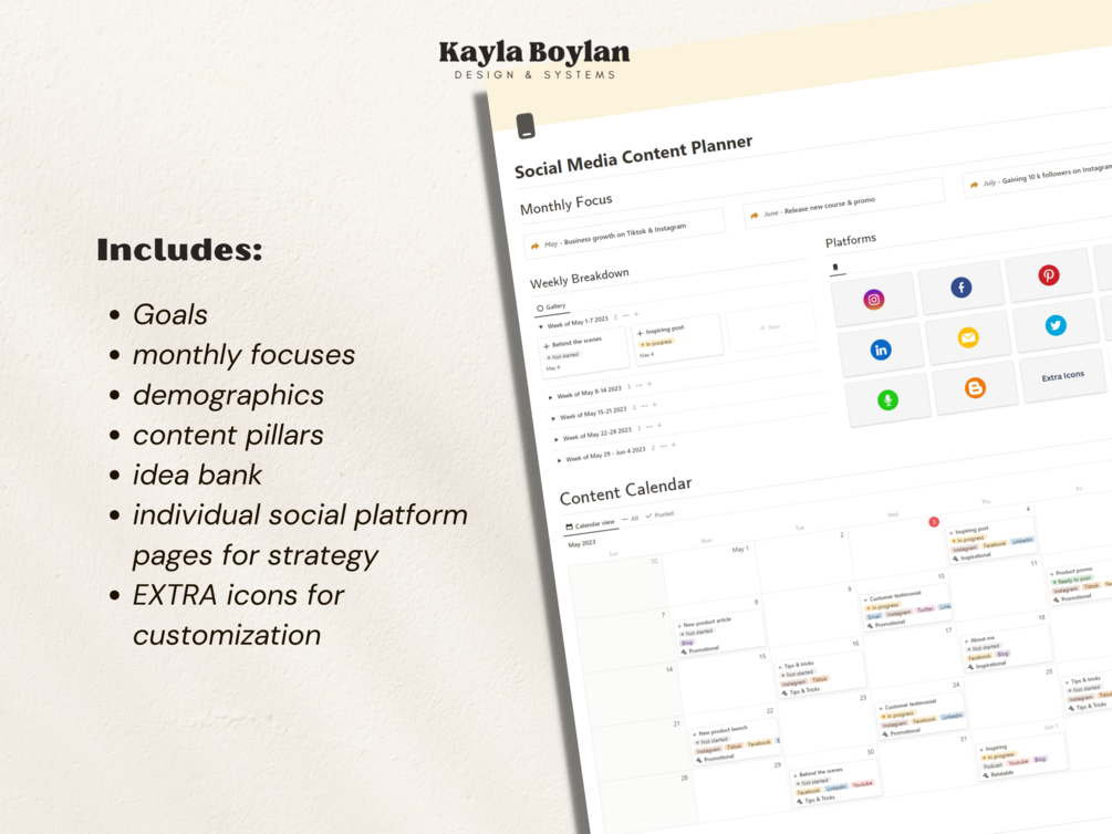 The Social Media Content Planner is a comprehensive template that empowers you to streamline your content planning process. With this digital product, you'll gain access to monthly focuses and goals, content pillars to define your brand identity, a content calendar for scheduling your posts, an idea bank for endless content inspiration, and individual social platform strategies to maximize engagement. Take control of your social media presence and deliver captivating content that resonates with your audience.